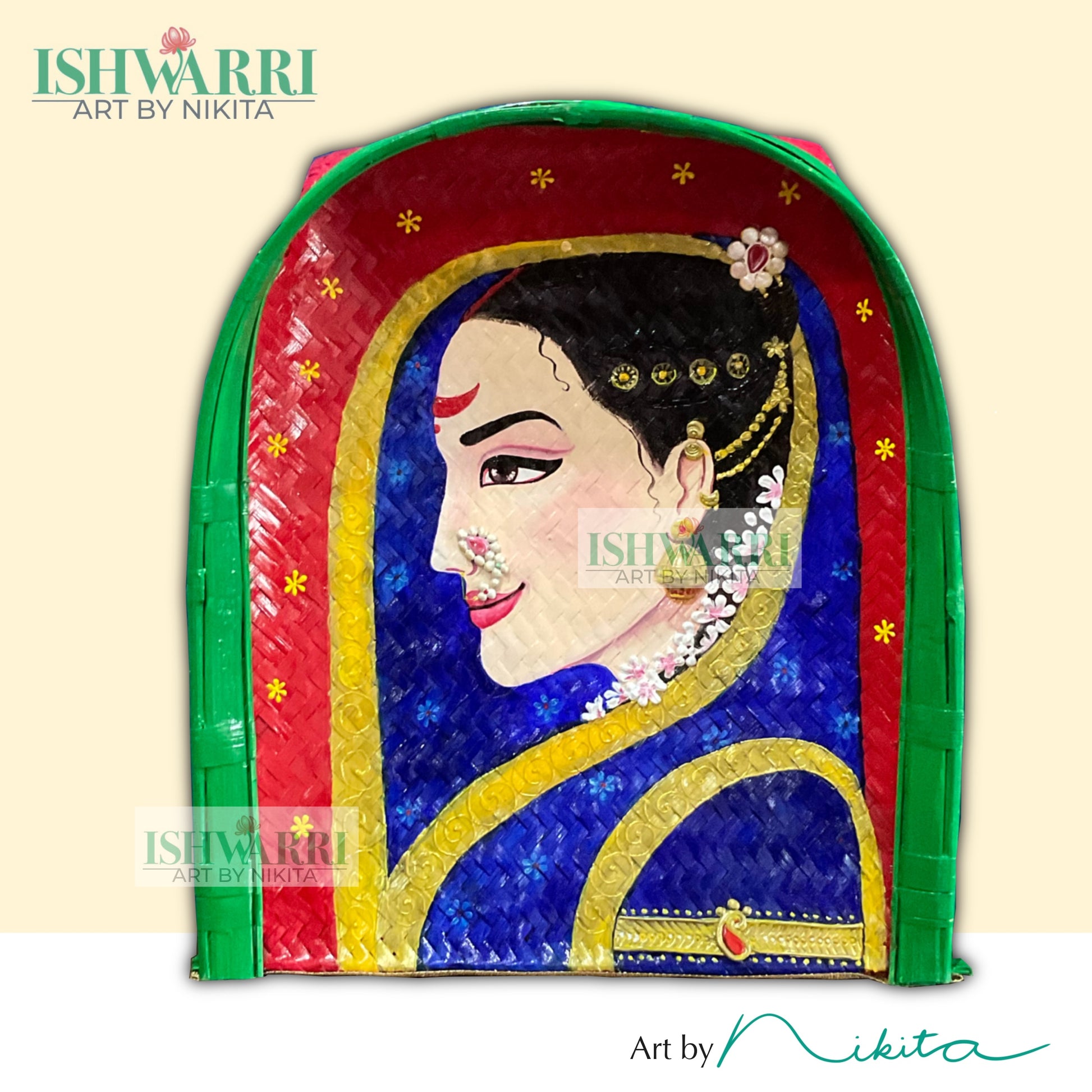 This is a beautifully hand-painted “Peshwai-themed cane supdi” showcasing a regal “Maharashtrian lady” adorned in traditional attire and jewellery. The vibrant red, blue, and gold palette enhances its richness, making it a perfect piece of art.