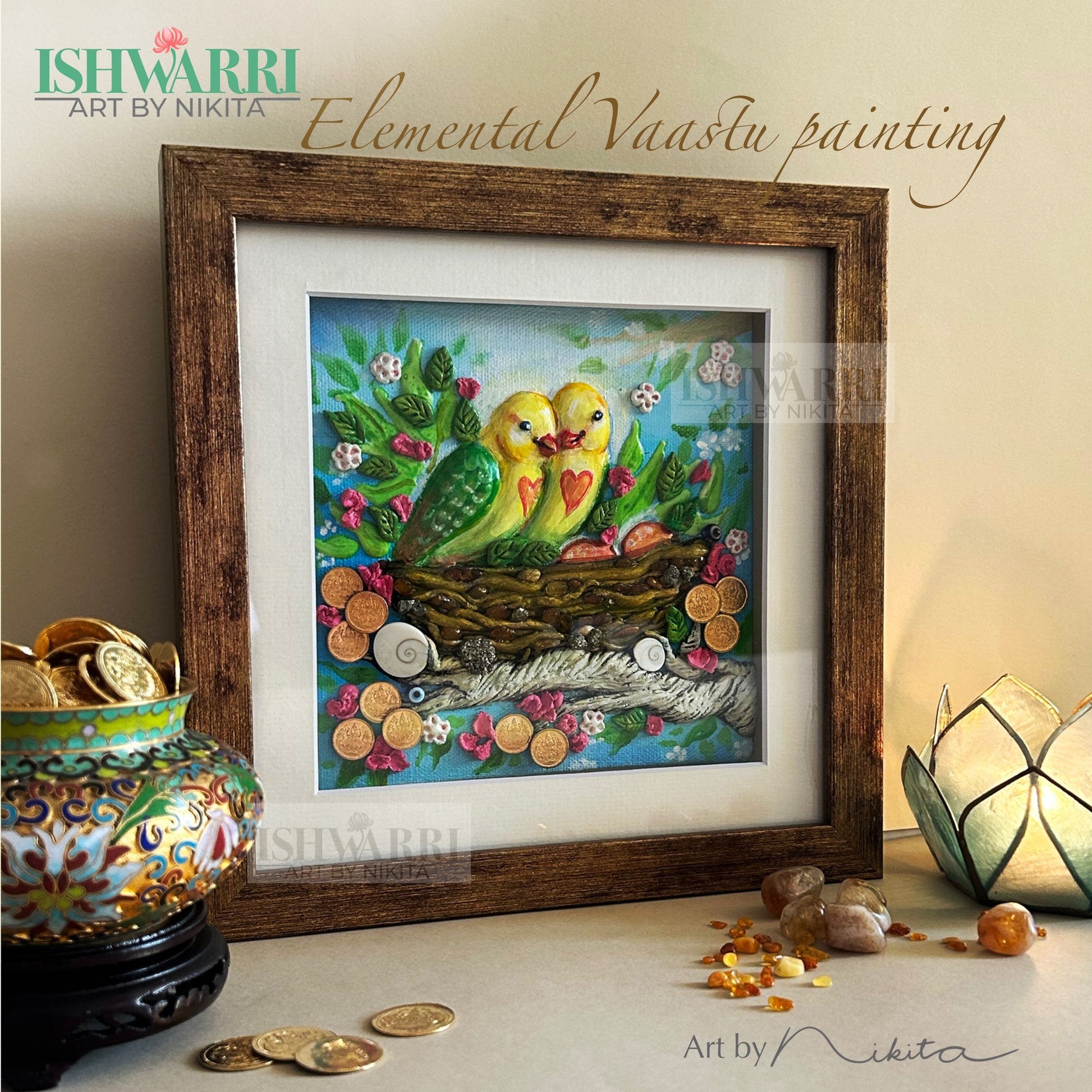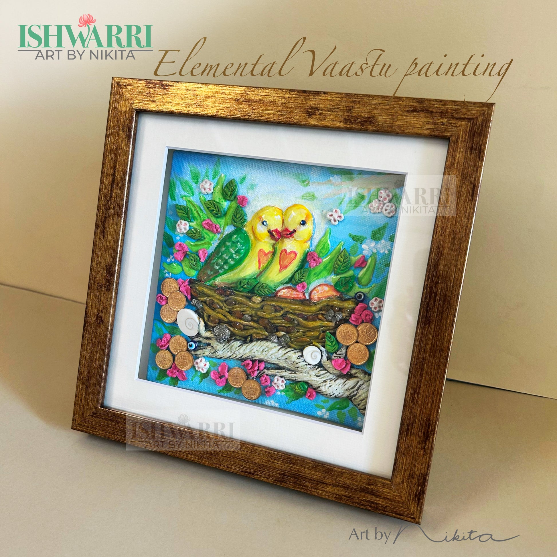 Perched on a sturdy branch, a nest cradles a pair of birds, symbolizing unity amid abundance. Accented with genuine crystals, Gomathi chakra, and coins, this 3D art piece radiates positive energy and embodies the spirit of togetherness. Ideal for enhancing your space and manifesting harmonious connections.