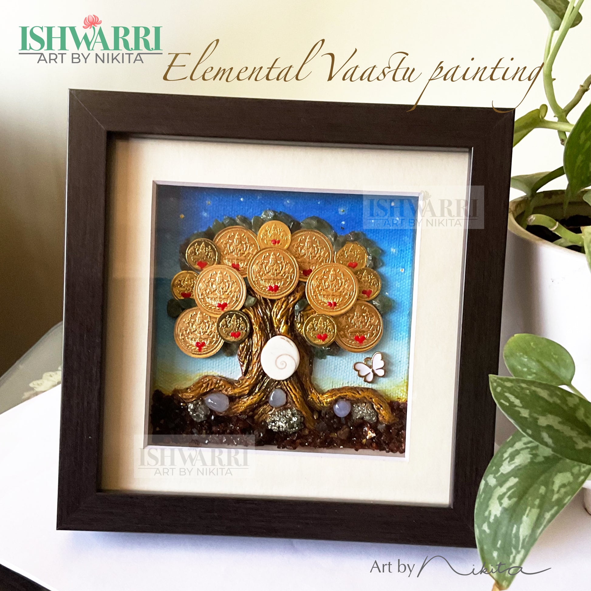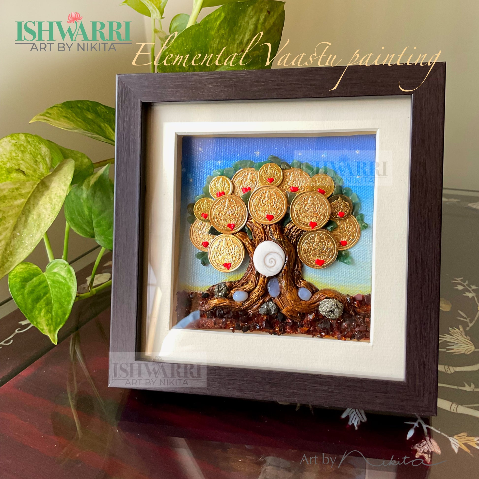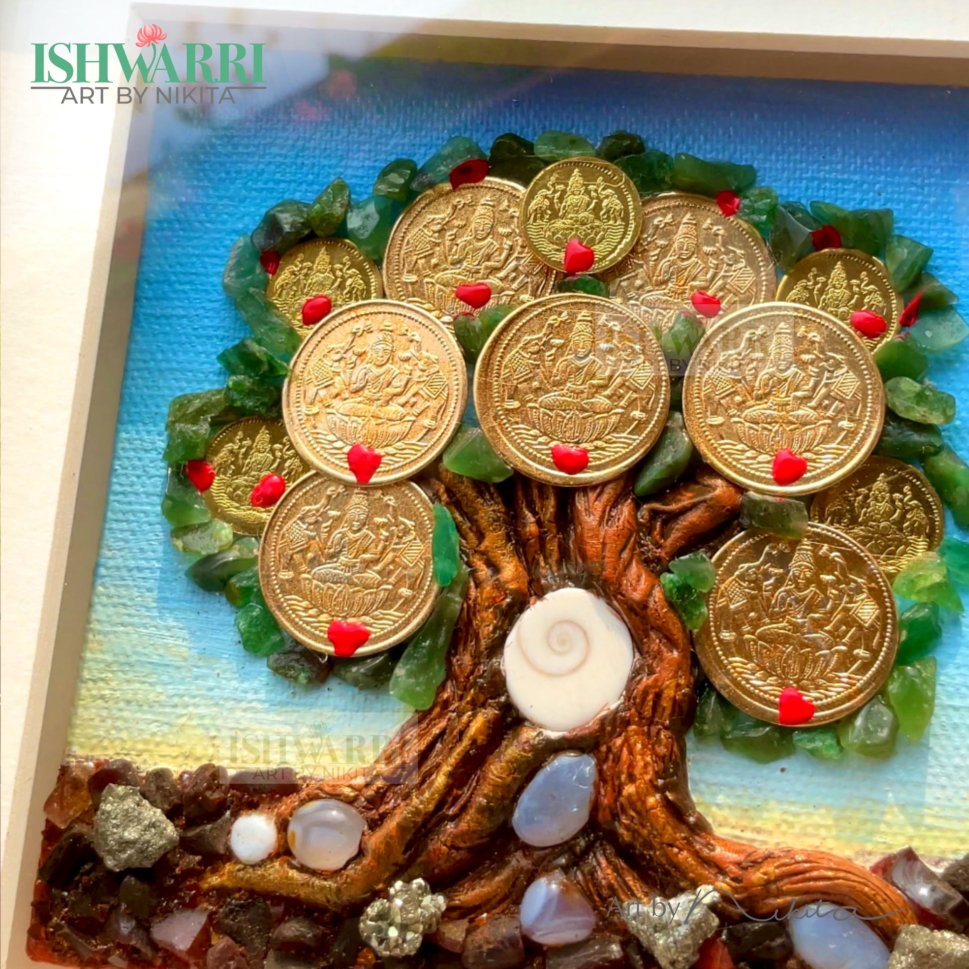A deeply rooted, robust tree with expansive branches exudes strength and stability. Symbolizing growth and life, it is paired with Lakshmi coins and genuine crystals like Pyrite and Gomti Chakra to represent prosperity. Infused with positive energy, this 3D art piece not only enhances your décor but also uplifts the vibes in your space, manifesting abundance and well-being. Its size is just right to display on a desk or table for easy visibility. A perfect gift for yourself and others.